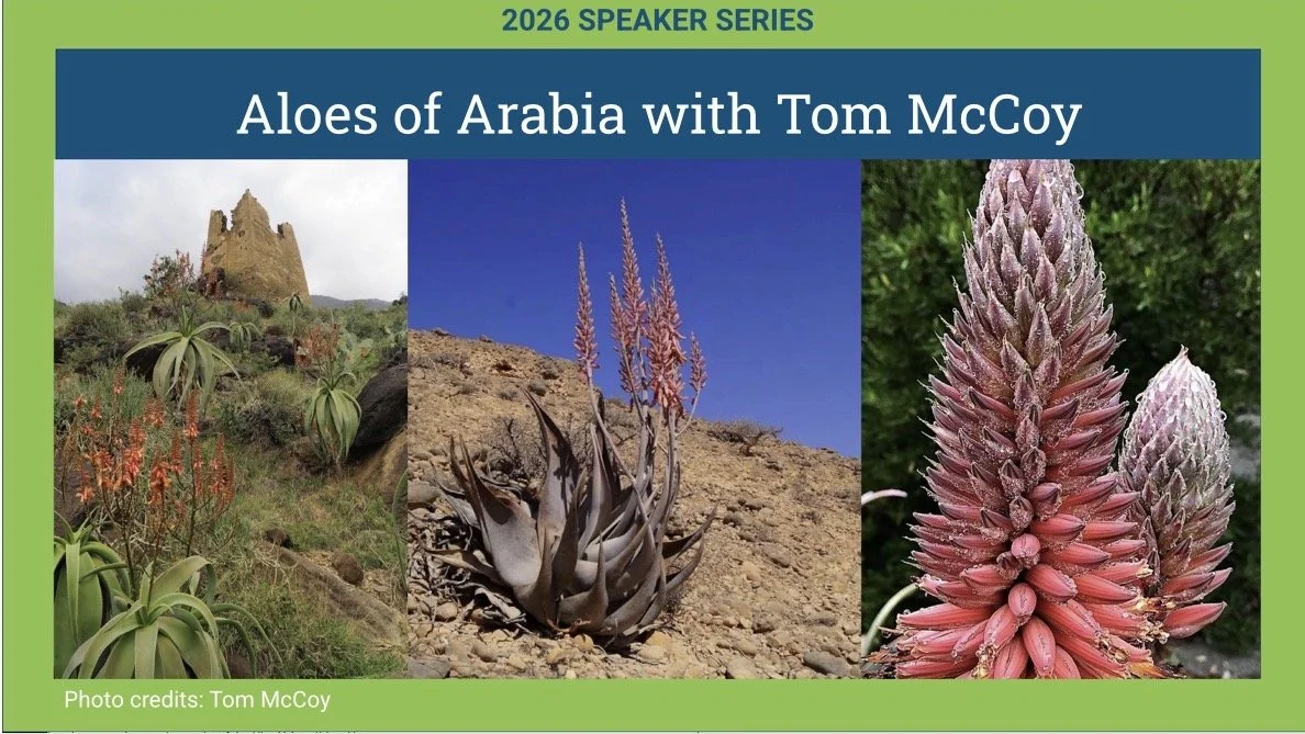 Tom McCoy, born in Long Beach, California, developed a deep passion for natural history from a young age, collecting fossils, seashells, reptiles, birds, and plants. His love for botany led him to travel extensively across Asia, Africa, the Americas, Arabia, and Madagascar. For over 30 years, McCoy has lived in Saudi Arabia, balancing his career with a focus on the genus Aloe. He has published extensively on the subject, naming over 50 species, wrote the book The Aloes of Arabia, and maintains one of the world’s largest documented live collections of Aloe. McCoy is also an accomplished aviculturist and bibliophile. He is a Fellow of the Linnean Society of London and holds memberships in numerous scientific organizations, including the American Society of Plant Taxonomists and the Botanical Society of America. Tom will be speaking about the aloes native to the Kingdom of Saudi Arabia and his personal experiences with them.